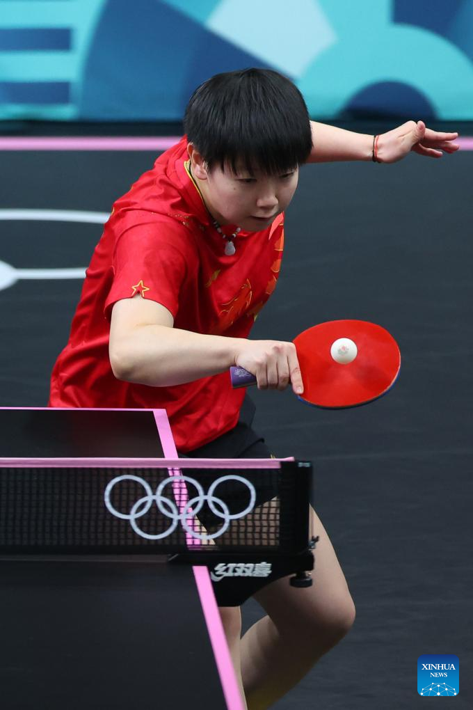 Sun Yingsha of China competes against Cheng I-Ching of Chinese Taipei during the women's team quarterfinal of table tennis between China and Chinese Taipei at the Paris 2024 Olympic Games in Paris, France, on Aug. 7, 2024. (Xinhua/Liu Xu)