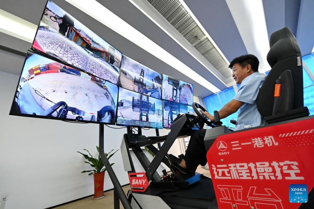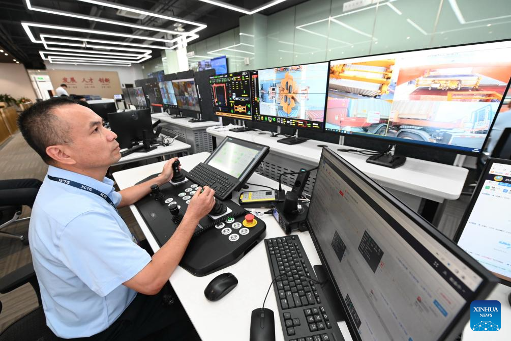 A staff member carries out a remote loading operation in Xiamen, southeast China's Fujian Province, Aug. 6, 2024. Xiamen Port has made its fully intelligent transformation in recent years. The container throughput of the port reached 12.55 million twenty-foot equivalent unit (TEU) in 2023. (Xinhua/Lin Shanchuan)