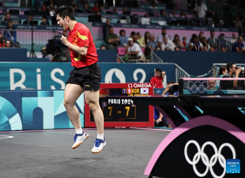 Fan Zhendong of China competes against Lim Jonghoon of South Korea during the men's team quarterfinal of table tennis between China and South Korea at the Paris 2024 Olympic Games in Paris, France, on Aug. 7, 2024. (Xinhua/Liu Xu)