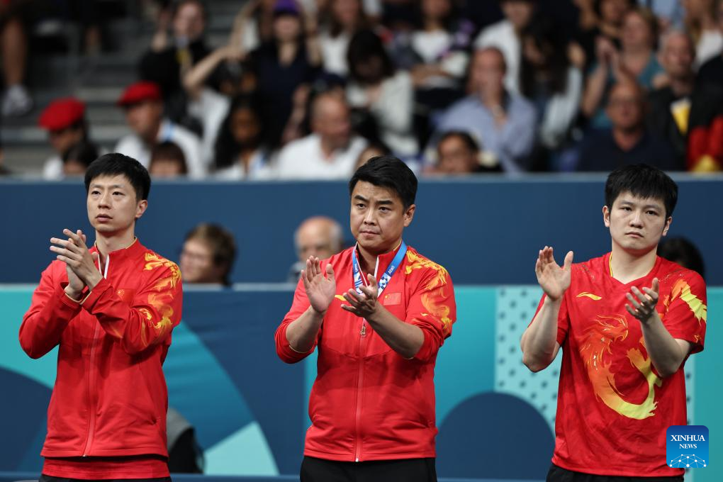 Coach Wang Hao (C), players Ma Long (L) and Fan Zhendong of China react during the men's team quarterfinal of table tennis between China and South Korea at the Paris 2024 Olympic Games in Paris, France, on Aug. 7, 2024. (Xinhua/Liu Xu)