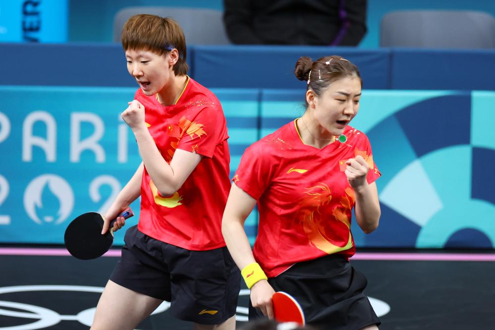 Chen Meng (R)/Wang Manyu of China celebrate scoring during the table tennis women's team semifinal between China and South Korea at the Paris Olympics on Aug. 8, 2024. (Xinhua/Liu Xu)