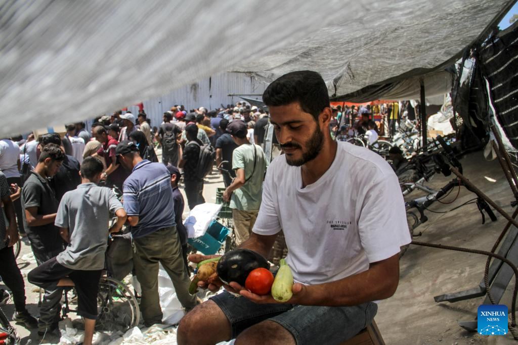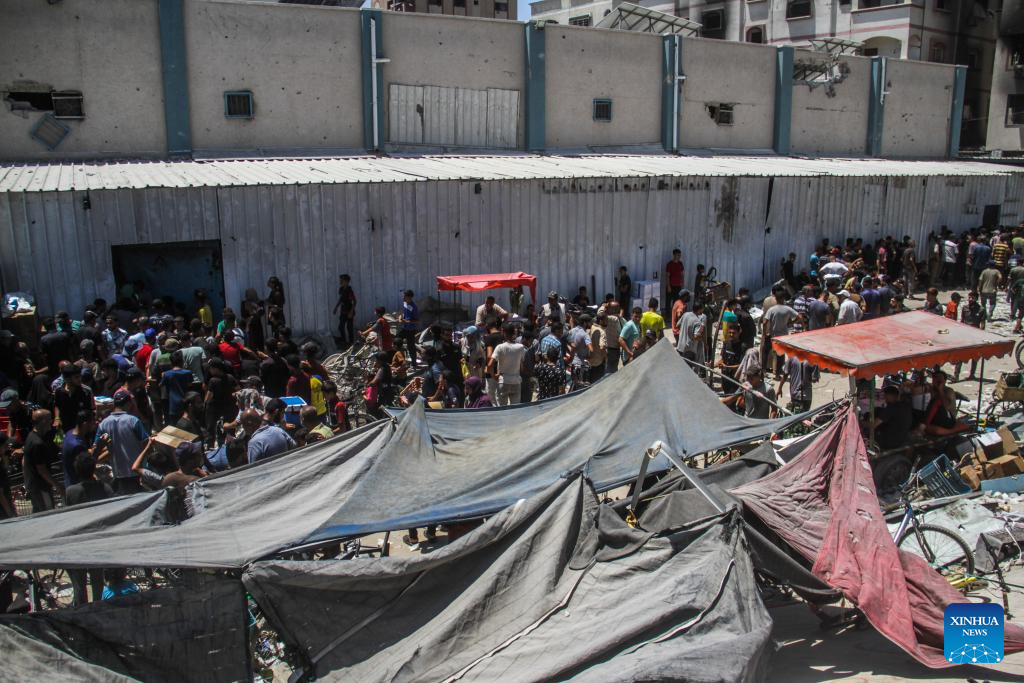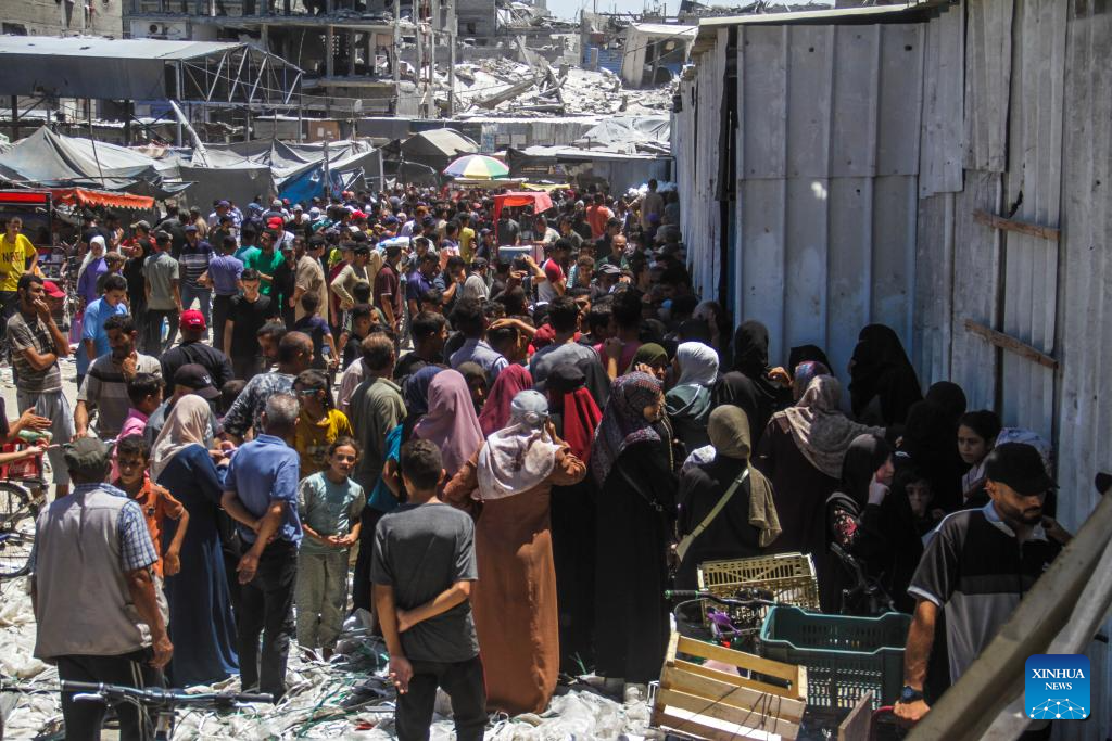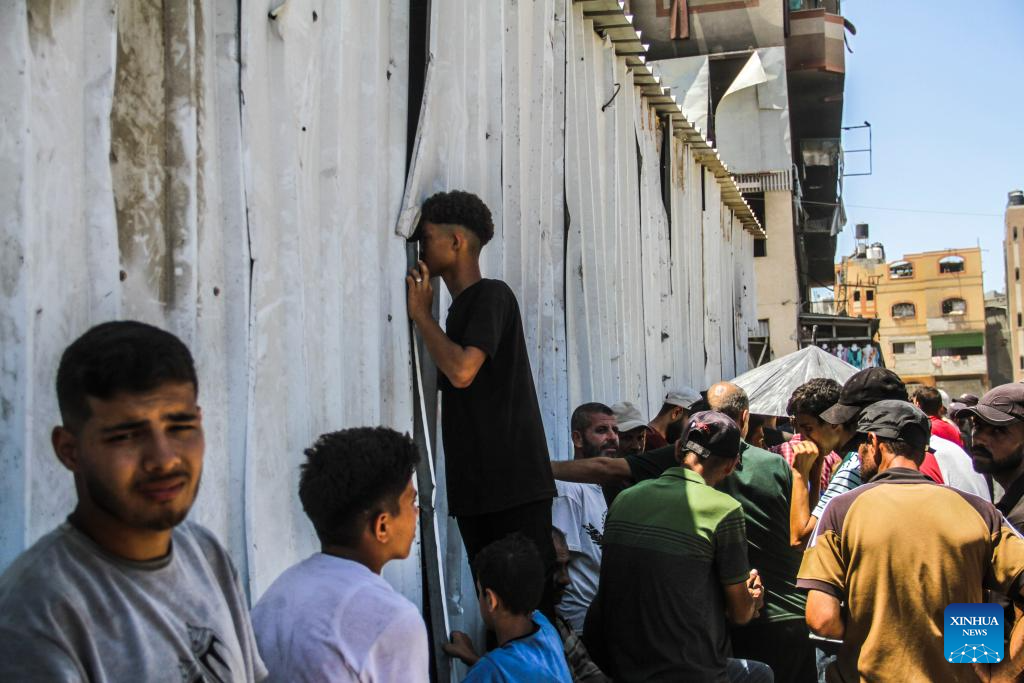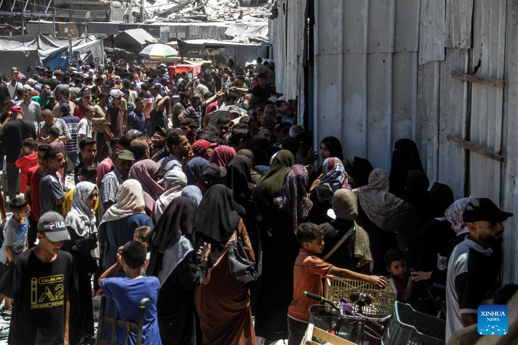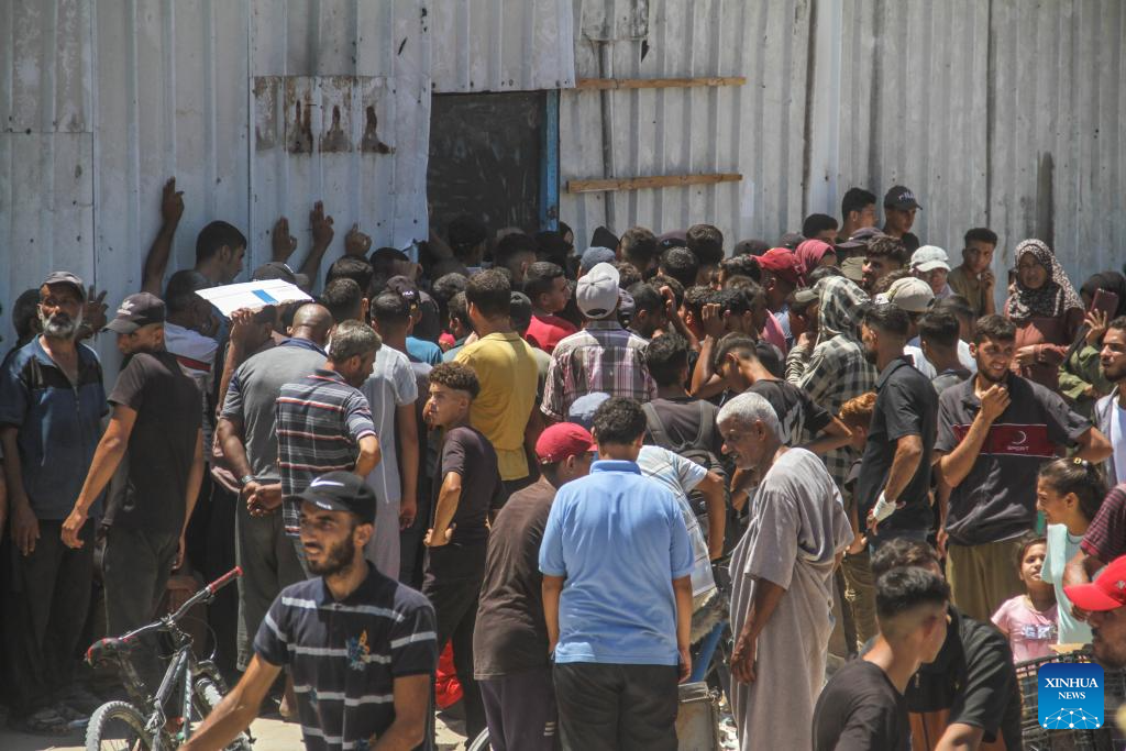 People gather to receive food aid at Jabalia refugee camp in the north of the Gaza Strip, on Aug. 8, 2024. The World Food Programme (WFP) warned that hostilities, damaged roads, and the lack of public order and safety severely hamper food transport operations in Gaza, forcing reduced rations. WFP urgently needs fuel deliveries, an increased flow of food supplies and a greater capacity to deliver hot meals, particularly in Gaza City and North Gaza. (Photo by Mahmoud Zaki/Xinhua)