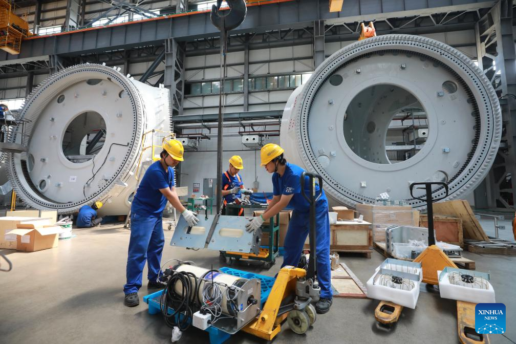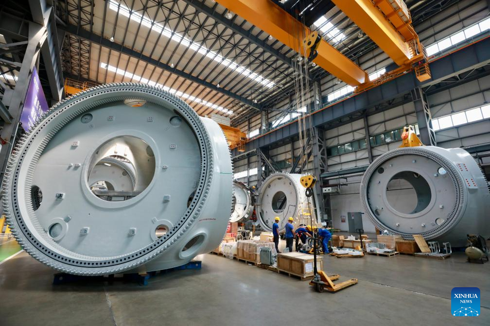 Workers of Dongfang Electric Wind Power Co., Ltd. produce offshore wind turbines of 18-megawatt at the Fujian Three Gorges Offshore Wind Power International Industrial Park in Fuqing City, southeast China's Fujian Province, Aug. 8, 2024. The industrial park, with a total investment of 4 billion yuan (about 557.7 million U.S. dollars), is the first full-industry-chain offshore wind power industrial park in China. (Xinhua/Jiang Kehong)