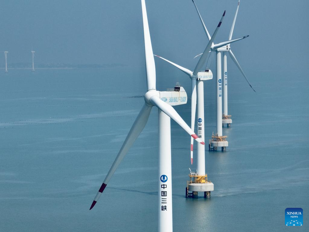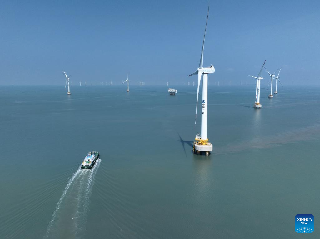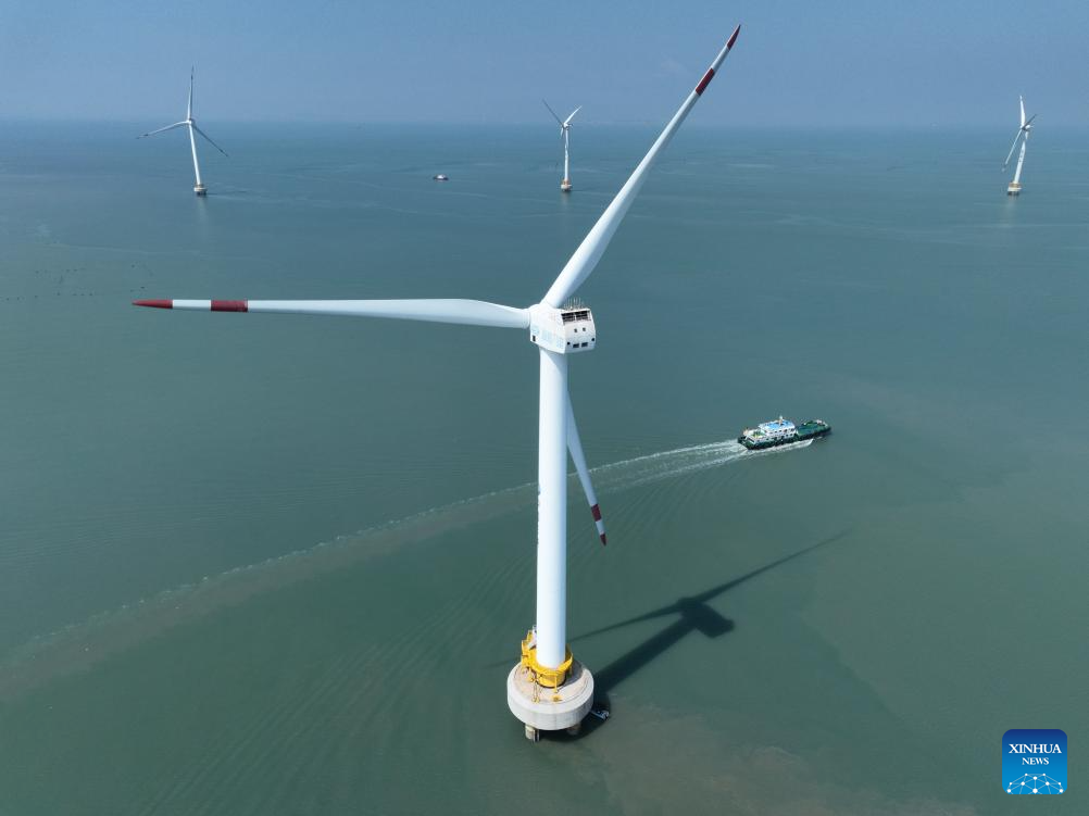 An aerial drone photo taken on Aug. 8, 2024 shows the Xinghua Bay pilot wind farm where some offshore wind turbines independently produced in Fujian Three Gorges Offshore Wind Power International Industrial Park are installed in Fuqing City, southeast China's Fujian Province. The industrial park, with a total investment of 4 billion yuan (about 557.7 million U.S. dollars), is the first full-industry-chain offshore wind power industrial park in China. (Xinhua/Jiang Kehong)