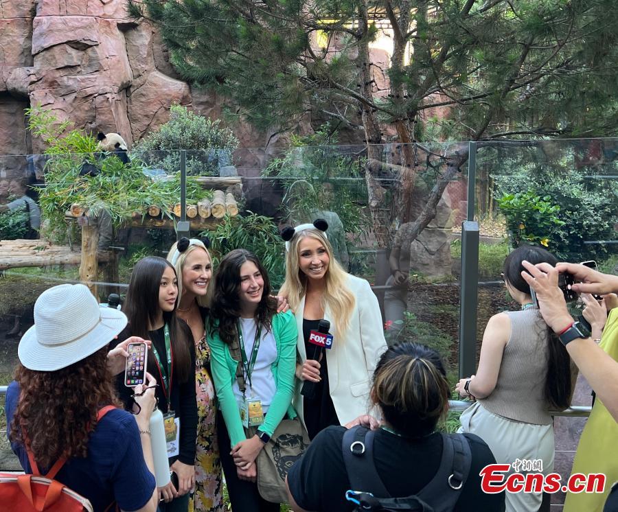 Visitors pose for photos with a giant panda at the San Diego Zoo, California, the United States, Aug. 8, 2024. (Photo: China News Service/Liu Guanguan)