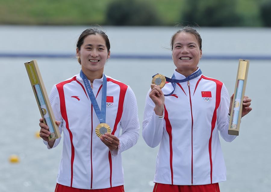 Gold medalists Xu Shixiao (R)/Sun Mengya of China attend the awarding ceremony after the women's canoe double 500m final of canoe sprint at the Paris 2024 Olympic Games in Vaires-sur-Marne, France, on Aug. 9, 2024. (Xinhua/Shen Bohan)