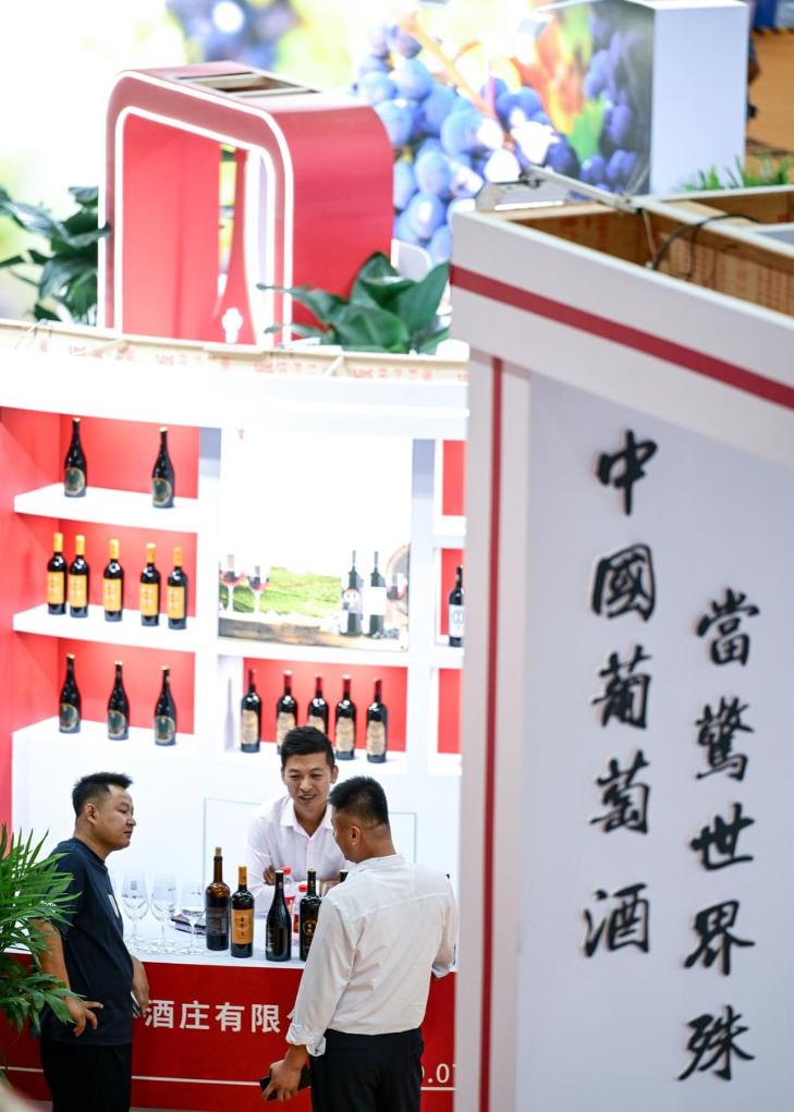 People visit the exhibition area of Ningxia Helan Mountian's East Foothill (Yinchuan) Sub-Region during the Fourth China (Ningxia) International Wine Culture and Tourism Expo in Yinchuan, northwest China's Ningxia Hui Autonomous Region, Aug. 9, 2024. (Xinhua/Feng Kaihua)
