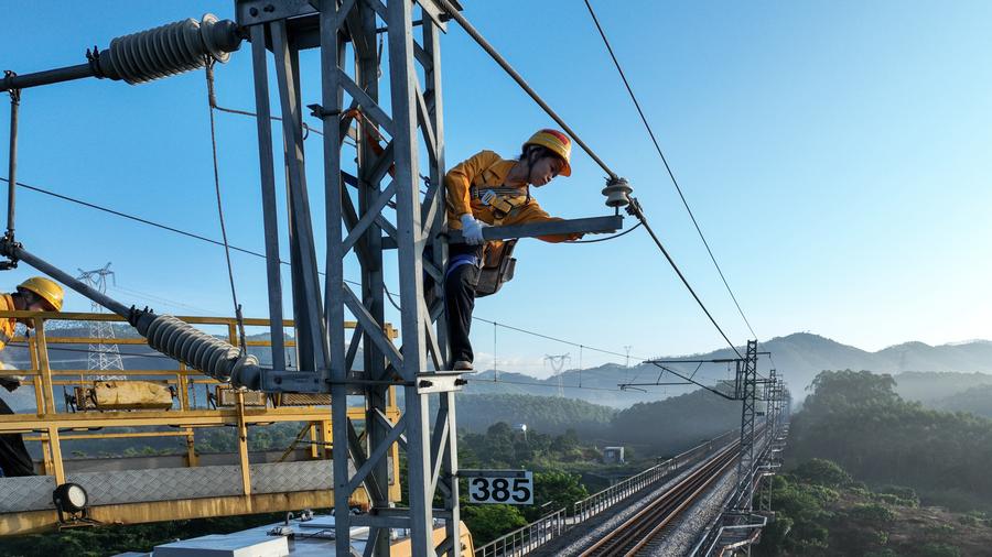 NANNING, Aug. 9 (Xinhua) -- Adorned with a safety helmet and enveloped in a protective suit, Chen Chuyan was diligently performing routine maintenance on the overhead power lines suspended above a railway in south China's Guangxi Zhuang Autonomous Region.