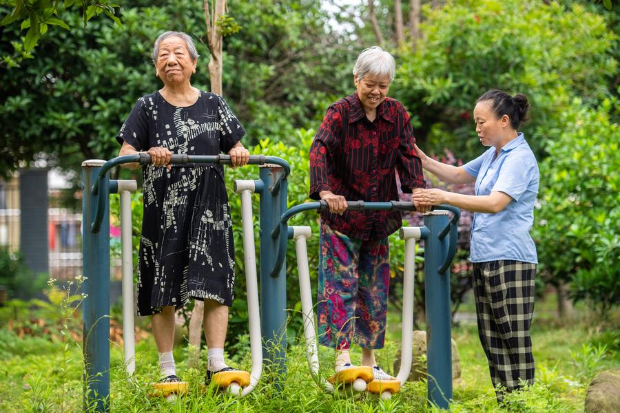 Senior residents exercise with the help of a staff member at a social welfare center in Hanshou County of Changde City, central China's Hunan Province, June 20, 2023. (Xinhua/Chen Sihan)