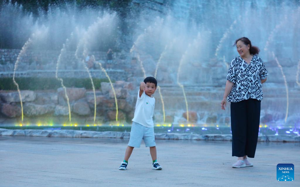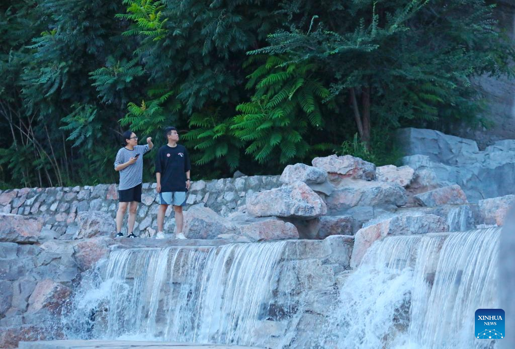 People visit the Beipiao mountain park in Beipiao City, northeast China's Liaoning Province, Aug. 8, 2024. Liaoning has strengthened restoration of ecological environment and accelerated the comprehensive treatment of mines in recent years. The quarry-transformed mountain park in Beipiao provides a summer resort for visitors. (Xinhua/Yang Qing)