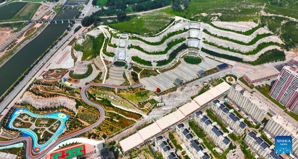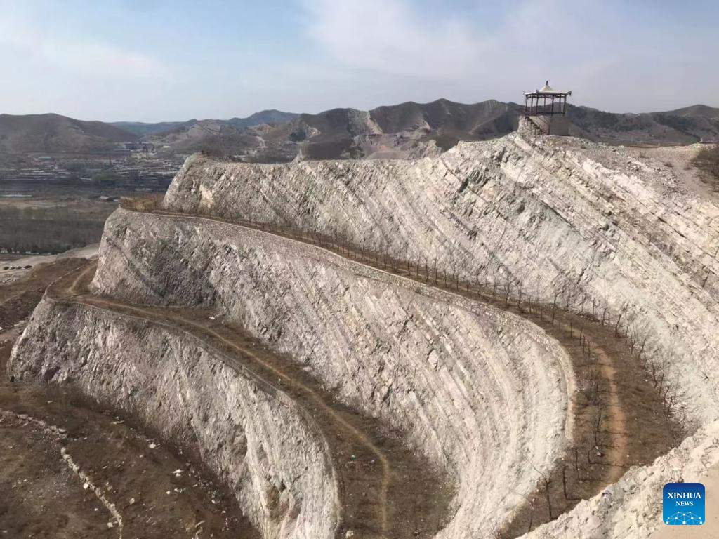 This photo taken on April 13, 2022 shows the Beipiao mountain park under construction in Beipiao City, northeast China's Liaoning Province. Liaoning has strengthened restoration of ecological environment and accelerated the comprehensive treatment of mines in recent years. The quarry-transformed mountain park in Beipiao provides a summer resort for visitors. (Xinhua)