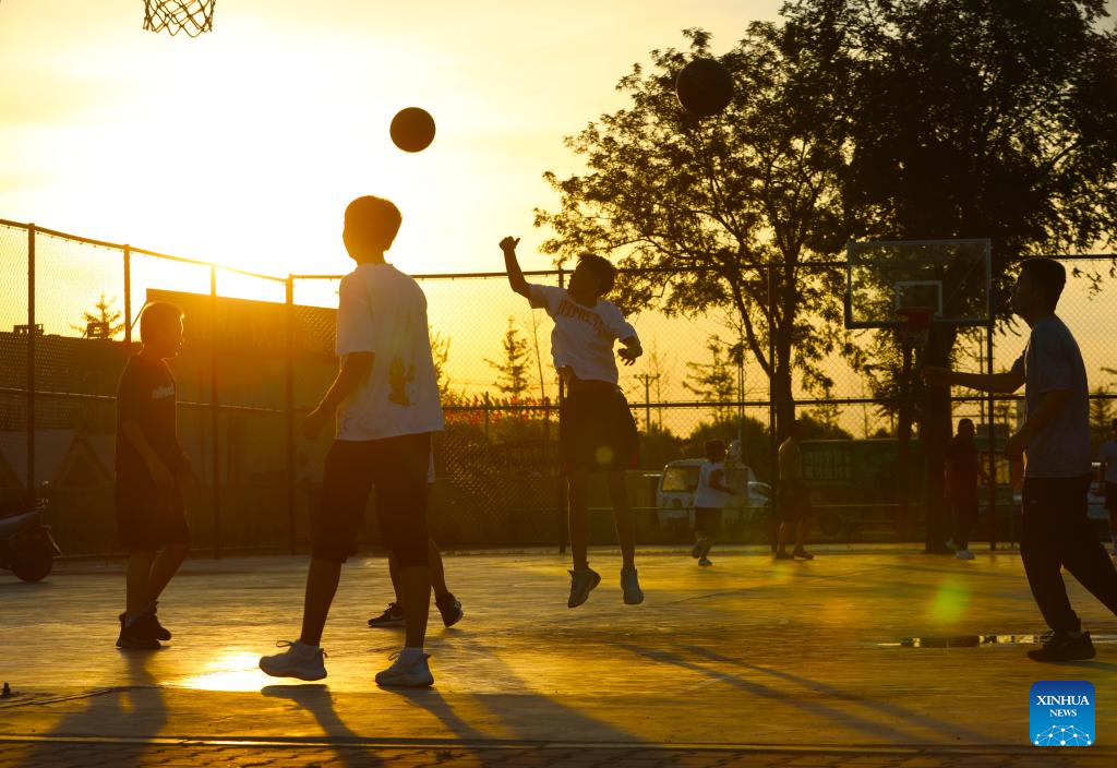 Citizens play basketball at the Beipiao mountain park in Beipiao City, northeast China's Liaoning Province, Aug. 8, 2024. Liaoning has strengthened restoration of ecological environment and accelerated the comprehensive treatment of mines in recent years. The quarry-transformed mountain park in Beipiao provides a summer resort for visitors. (Xinhua/Yang Qing)