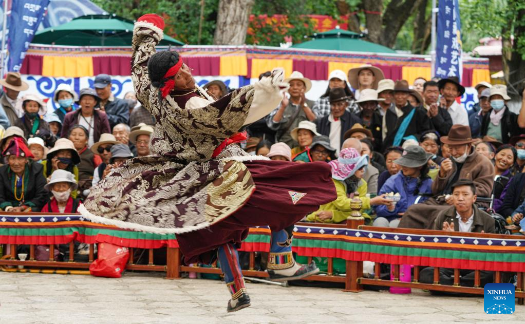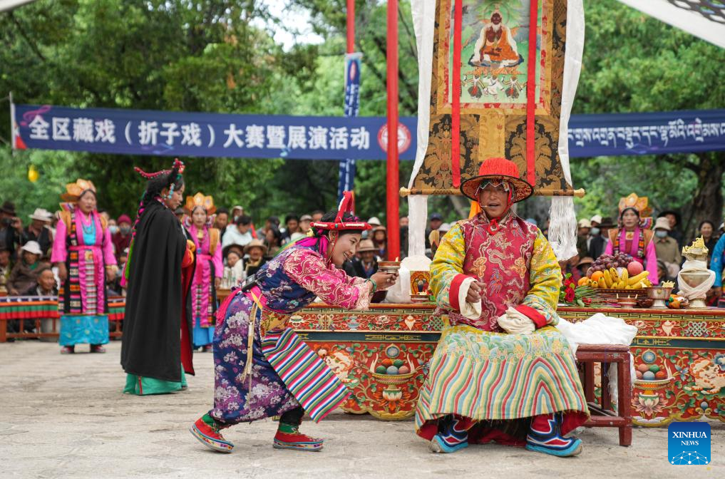 Artists stage a Tibetan opera performance at Norbulingka in Lhasa, southwest China's Xizang Autonomous Region, Aug. 8, 2024. Tibetan opera performances are staged here from Aug. 4 to Aug. 10 in celebration of the traditional Shoton Festival, or Yogurt Festival. (Xinhua/Jigme Dorje)