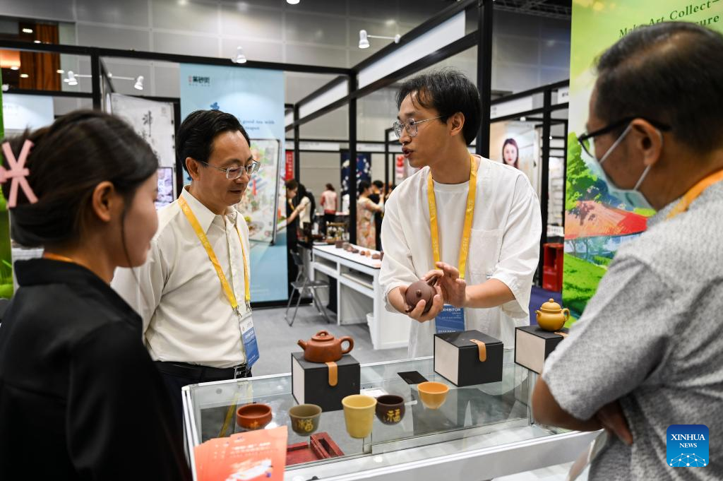 An exhibitor introduces a purple clay teapot to visitors during the China Jiangsu Service Trade Expo 2024 in Kuala Lumpur, Malaysia, Aug. 9, 2024.The China Jiangsu Service Trade Expo 2024 kicked off in Kuala Lumpur on Friday, featuring Jiangsu cultural specialties, traditional Chinese medicine, gastronomy and international tourism, intellectual property, international education and business services. (Xinhua/Cheng Yiheng)