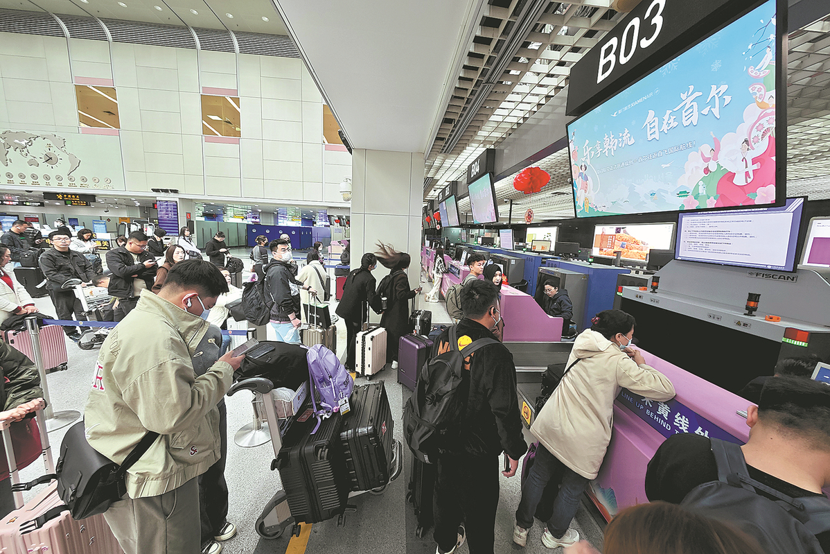 Passengers boarding the Air China flight from Jeju to Beijing take photos in the check-in area at Jeju International Airport in South Korea on March 31, when the resumption ceremony of the Air China Beijing-Jeju route was held. (SUN YIRAN/XINHUA)