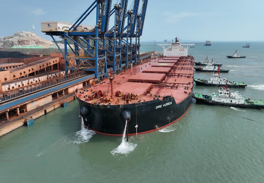 A drone photo taken on Aug. 7, 2024 shows an iron ore cargo ship from Brazil docking at a port of the Meizhou Bay of Putian City, southeast China's Fujian Province. (Xinhua/Lin Shanchuan)