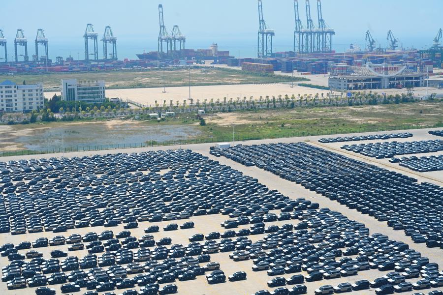 Motor vehicles for export wait to be loaded at the Fuzhou port in Fuzhou, southeast China's Fujian Province, Aug. 8, 2024. (Xinhua/Lin Shanchuan)