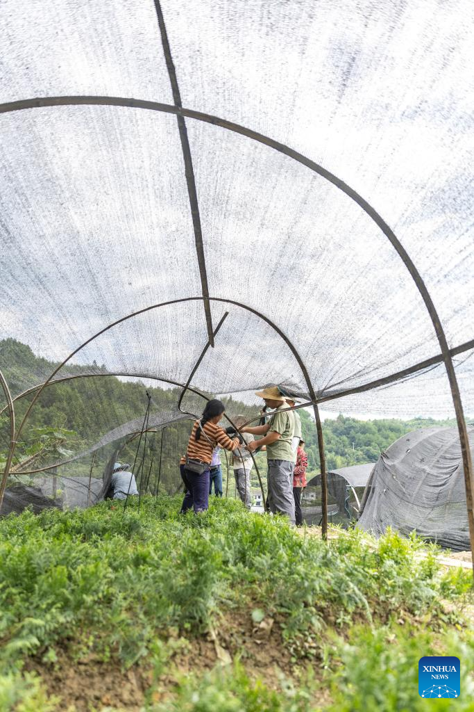 Staff members of the Thuja sutchuenensis research base of Xuebaoshan national nature reserve build a sunshade for Thuja sutchuenensis seedlings at the research base in Kaizhou District of southwest China's Chongqing, Aug. 7, 2024. (Xinhua/Huang Wei)