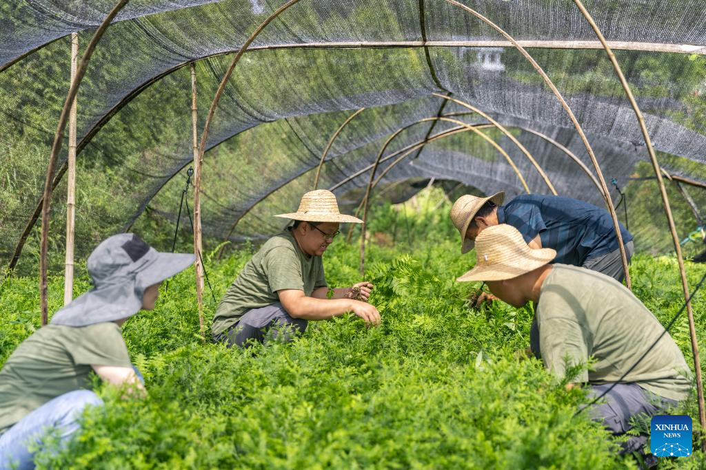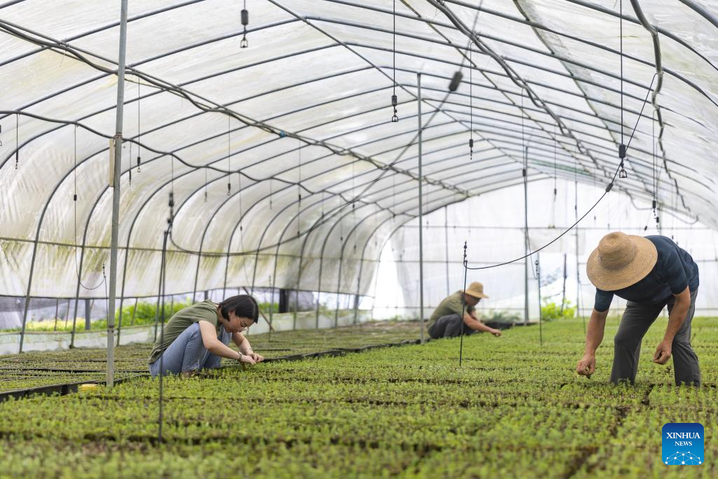 Staff members of the Thuja sutchuenensis research base of Xuebaoshan national nature reserve remove the weeds among Thuja sutchuenensis seedlings at the research base in Kaizhou District of southwest China's Chongqing, Aug. 7, 2024. (Xinhua/Huang Wei)