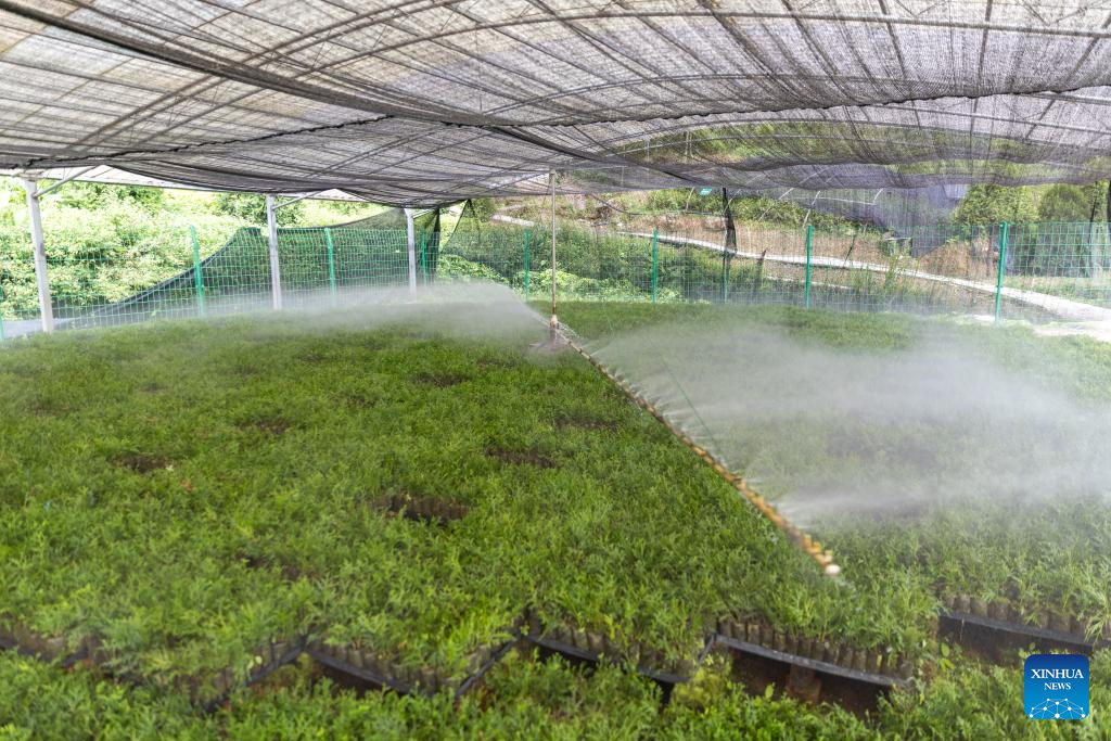 Automatic spraying device waters Thuja sutchuenensis seedlings at the Thuja sutchuenensis research base of Xuebaoshan national nature reserve in Kaizhou District of southwest China's Chongqing, Aug. 7, 2024. (Xinhua/Huang Wei)