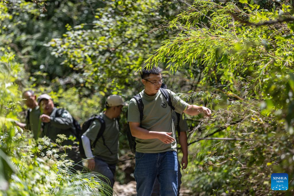 Staff members of the Thuja sutchuenensis research base of Xuebaoshan national nature reserve patrol the fields at the nature reserve in Kaizhou District of southwest China's Chongqing, Aug. 8, 2024. (Xinhua/Huang Wei)