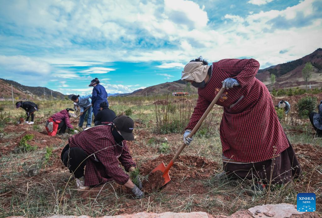 Workers transplant Thuja sutchuenensis seedlings at a forestry base in Mangkam County, Qamdo, southwest China's Xizang Autonomous Region, June 5, 2024. (Photo by Zheng Yu/Xinhua)