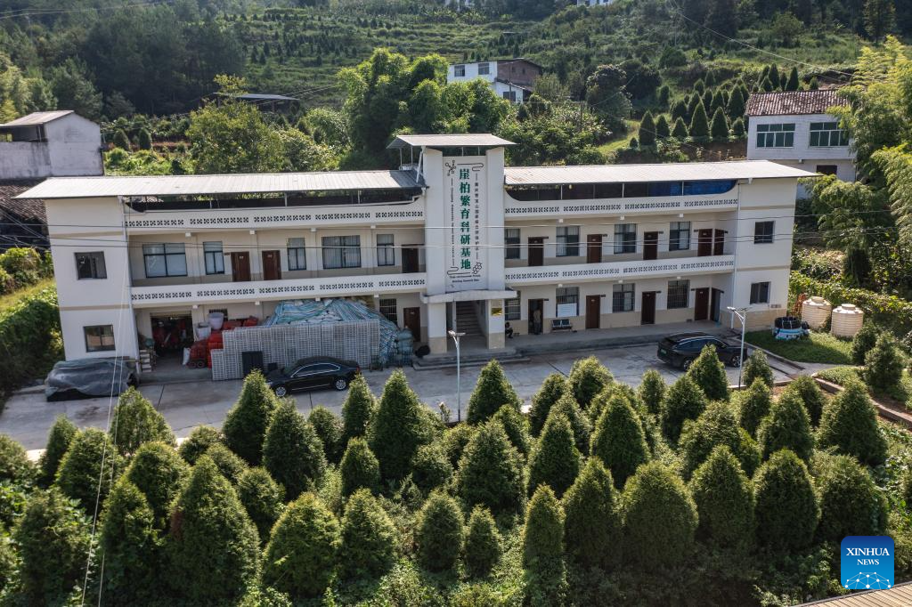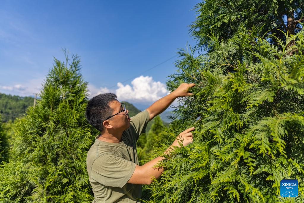 A staff member of the Thuja sutchuenensis research base of Xuebaoshan national nature reserve checks the condition of Thuja sutchuenensis seeds at the research base in Kaizhou District of southwest China's Chongqing, Aug. 7, 2024. (Xinhua/Huang Wei)
