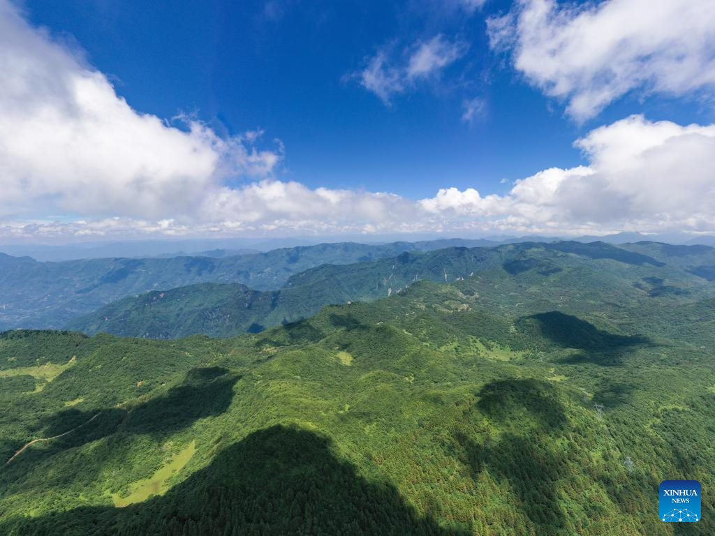 An aerial drone photo taken on Aug. 7, 2024 shows a view of the Thuja sutchuenensis research base of Xuebaoshan national nature reserve in Kaizhou District of southwest China's Chongqing. (Xinhua/Huang Wei)