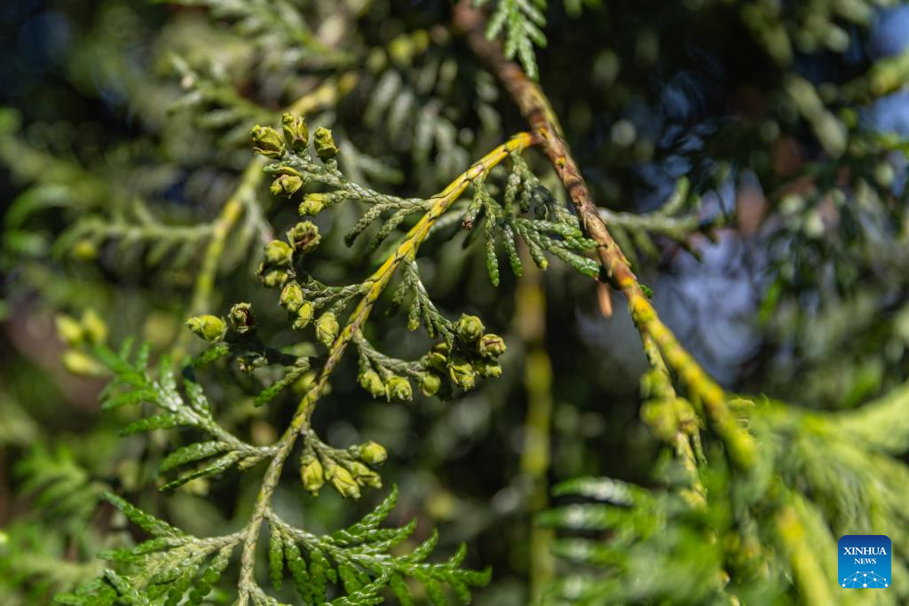 Seeds of Thuja sutchuenensis plants are seen at the Thuja sutchuenensis research base of Xuebaoshan national nature reserve in Kaizhou District of southwest China's Chongqing, Aug. 7, 2024. (Xinhua/Huang Wei)