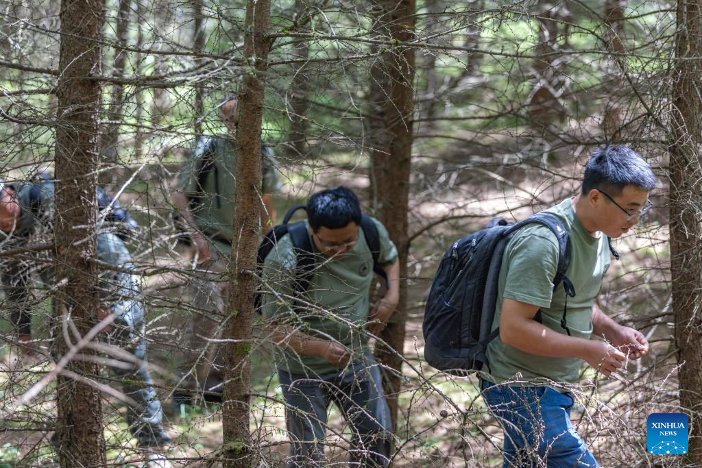 Staff members of the Thuja sutchuenensis research base of Xuebaoshan national nature reserve take records of Thuja sutchuenensis seedlings after transplantation at a forestry base in Mangkam County, Qamdo, southwest China's Xizang Autonomous Region, June 5, 2024. (Photo by Zheng Yu/Xinhua)