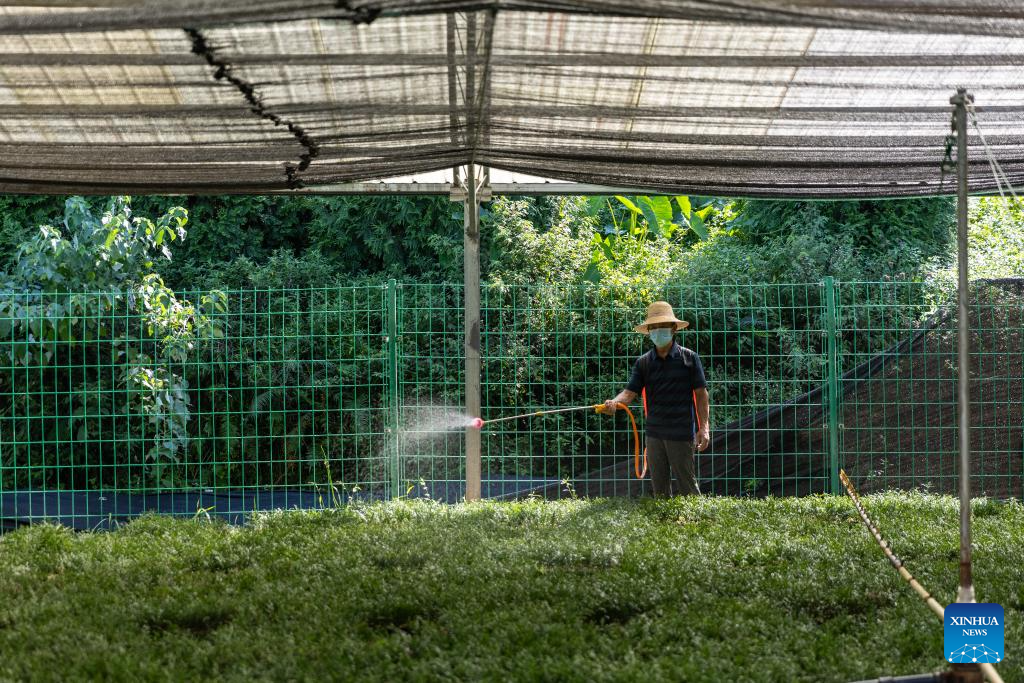 A staff member of the Thuja sutchuenensis research base of Xuebaoshan national nature reserve sprays pesticide over Thuja sutchuenensis seedlings at the research base in Kaizhou District of southwest China's Chongqing, Aug. 7, 2024. (Xinhua/Huang Wei)