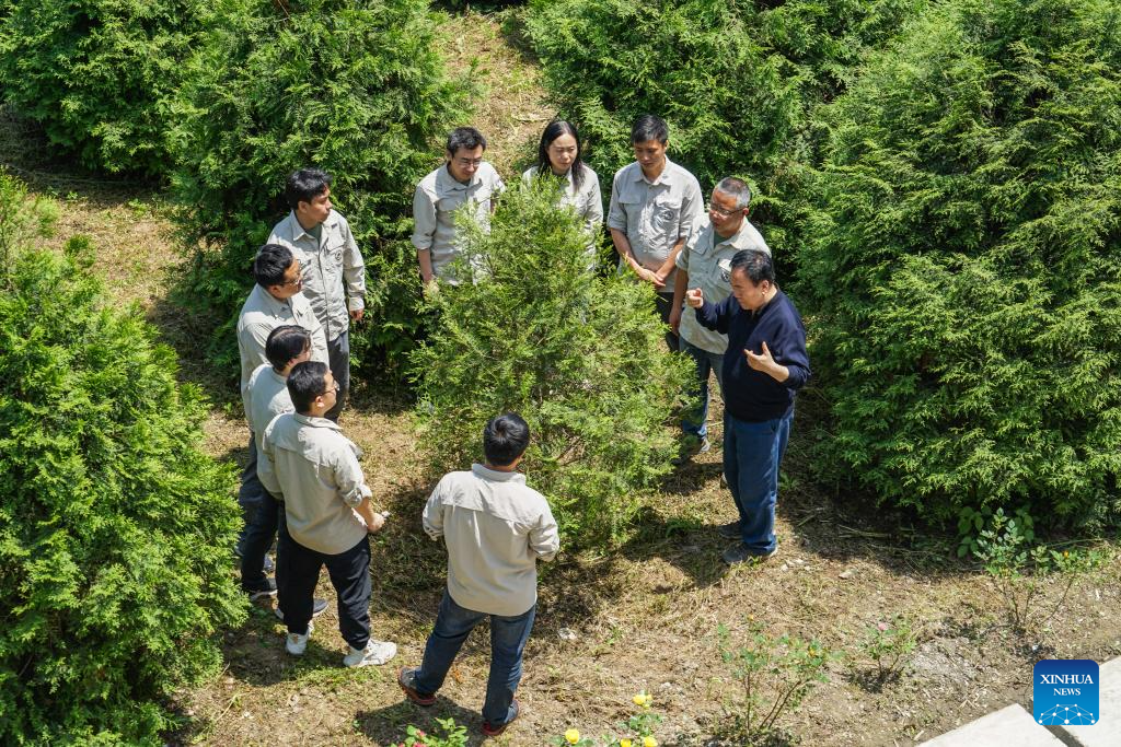 Staff members of the Thuja sutchuenensis research base of Xuebaoshan national nature reserve discuss the breeding technique with Guo Quanshui (1st R), expert from Chinese Academy of Forestry, at the research base in Kaizhou District of southwest China's Chongqing, April 26, 2024. (Xinhua)