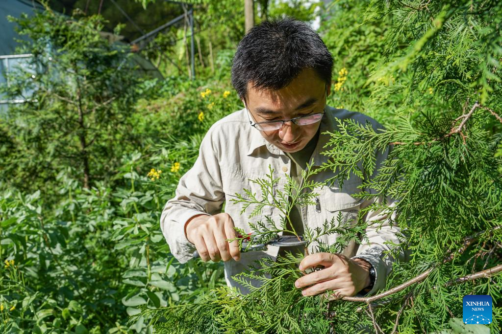 A staff member of the Thuja sutchuenensis research base of Xuebaoshan national nature reserve takes a cutting of Thuja sutchuenensis plant at the research base in Kaizhou District of southwest China's Chongqing, April 26, 2024. (Xinhua)