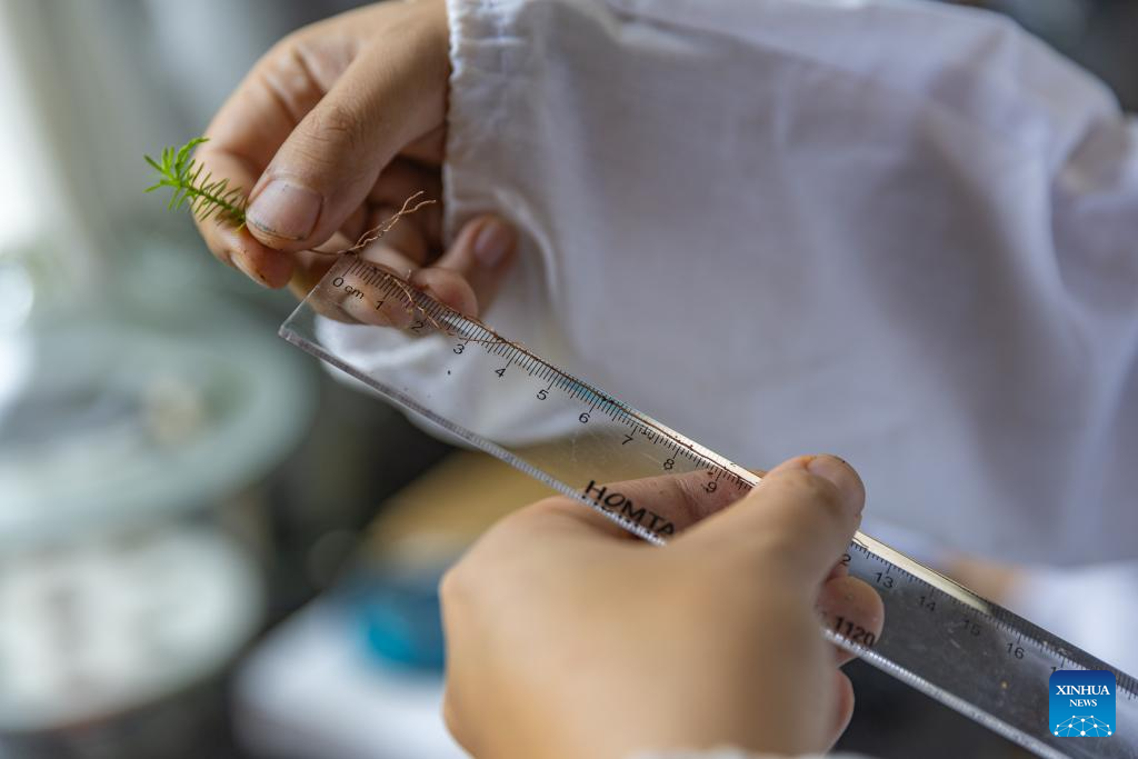 A staff member of the Thuja sutchuenensis research base of Xuebaoshan national nature reserve measures the length of the root of a Thuja sutchuenensis seedling at the research base in Kaizhou District of southwest China's Chongqing, Aug. 7, 2024. (Xinhua/Huang Wei)