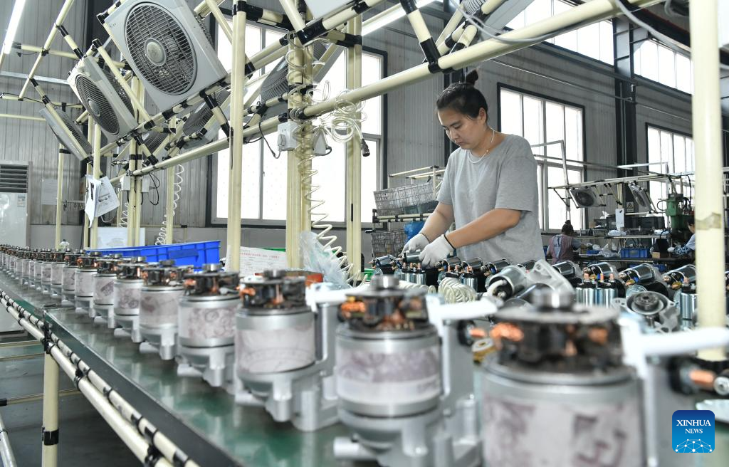 A man works on an automotive parts production line at Hebei Jianglun Electrical Co., Ltd. in Hejian city, north China's Hebei province, Aug. 10, 2024. There are more than 170 remanufaturing enterprises in Hejian city, focusing on areas of automotive parts, oil drilling equipment, and computer servers. They were recognized by the Ministry of Industry and Information Technology as a distinctive industrial cluster of small and medium enterprises in 2022, and generated a combined revenue of more than 14 billion yuan (about 1.96 billion US dollars) in 2023. (Xinhua/Mu Yu)