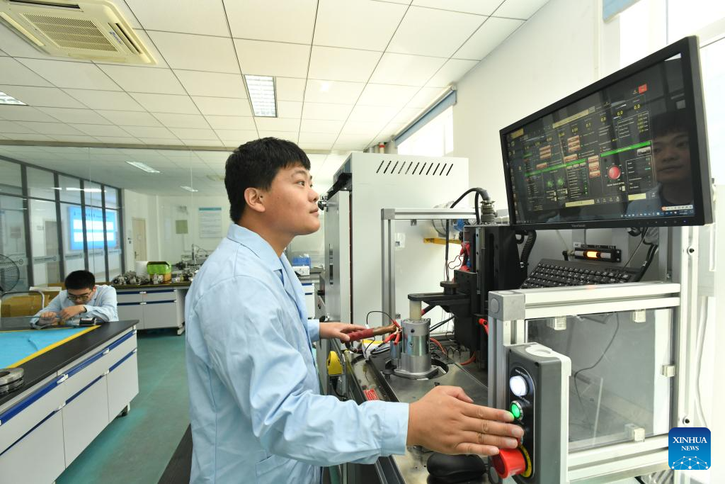 A technician works at a laboratory of the Institute of Remanufaturing Industry &Technology, Jing-Jin-Ji in Hejian city, north China's Hebei province, Aug. 10, 2024. There are more than 170 remanufaturing enterprises in Hejian city, focusing on areas of automotive parts, oil drilling equipment, and computer servers. They were recognized by the Ministry of Industry and Information Technology as a distinctive industrial cluster of small and medium enterprises in 2022, and generated a combined revenue of more than 14 billion yuan (about 1.96 billion US dollars) in 2023. (Xinhua/Mu Yu)