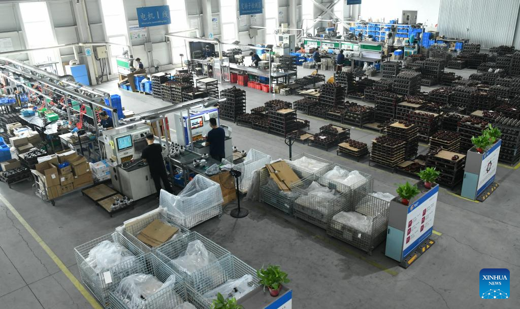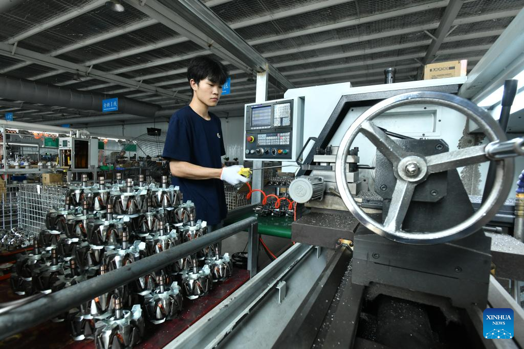A worker tests products at Hebei Ailees Auto Parts Co., Ltd. in Hejian city, north China's Hebei province, Aug. 10, 2024. There are more than 170 remanufaturing enterprises in Hejian city, focusing on areas of automotive parts, oil drilling equipment, and computer servers. They were recognized by the Ministry of Industry and Information Technology as a distinctive industrial cluster of small and medium enterprises in 2022, and generated a combined revenue of more than 14 billion yuan (about 1.96 billion US dollars) in 2023. (Xinhua/Mu Yu)
