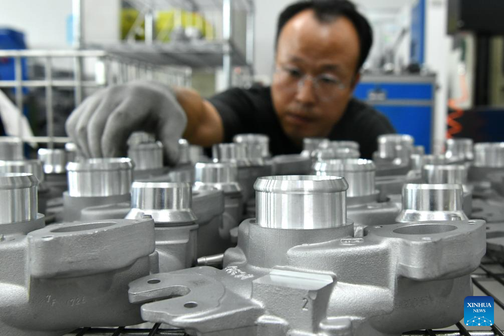 A worker operates at a workshop of Turbo Auto Parts Remanufaturing (Hebei) Co., Ltd. in Hejian city, north China's Hebei province, Aug. 10, 2024. There are more than 170 remanufaturing enterprises in Hejian city, focusing on areas of automotive parts, oil drilling equipment, and computer servers. They were recognized by the Ministry of Industry and Information Technology as a distinctive industrial cluster of small and medium enterprises in 2022, and generated a combined revenue of more than 14 billion yuan (about 1.96 billion US dollars) in 2023. (Xinhua/Mu Yu)