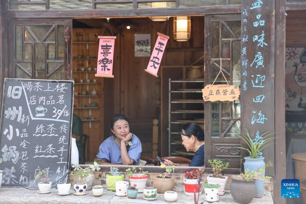 Tourists have tea at Jiuzhou ancient town scenic area of Anshun City, southwest China's Guizhou Province, July 24, 2024.
