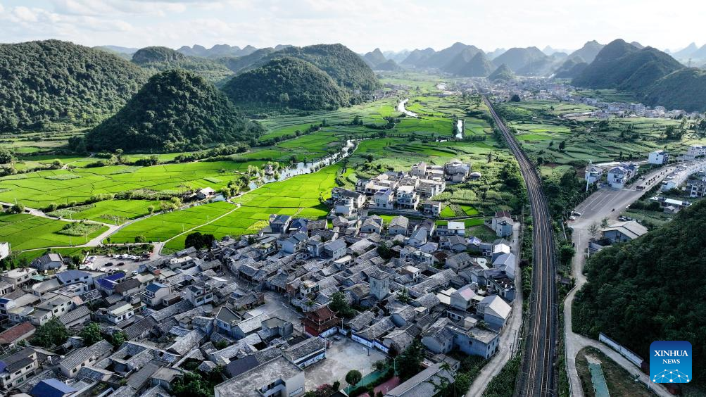 An aerial drone photo taken on July 23, 2024 shows a view of Yunshantun Village in Xixiu District of Anshun City, southwest China's Guizhou Province.