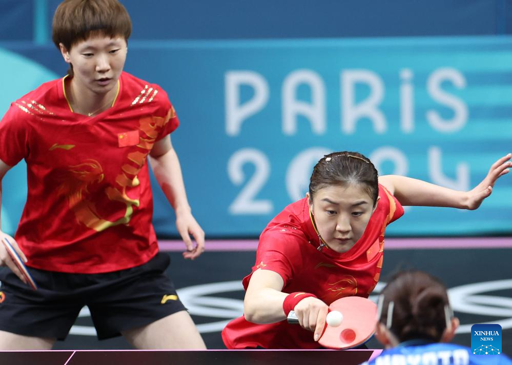 Chen Meng (L)/Wang Manyu of China compete against Hayata Hina/Harimoto Miwa of Japan during the women's team gold medal match of table tennis between China and Japan at the Paris 2024 Olympic Games in Paris, France, on Aug. 10, 2024. (Xinhua/Liu Xu)