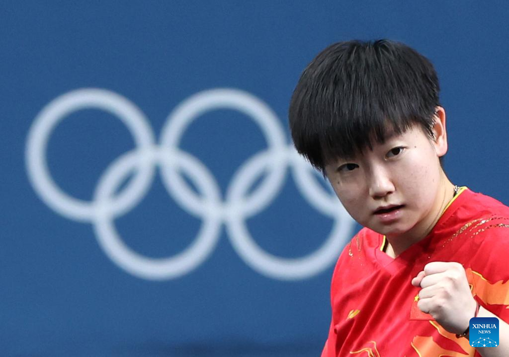 Sun Yingsha of China reacts while competing against Hirano Miu of Japan during the women's team gold medal match of table tennis between China and Japan at the Paris 2024 Olympic Games in Paris, France, on Aug. 10, 2024. (Xinhua/Liu Xu)