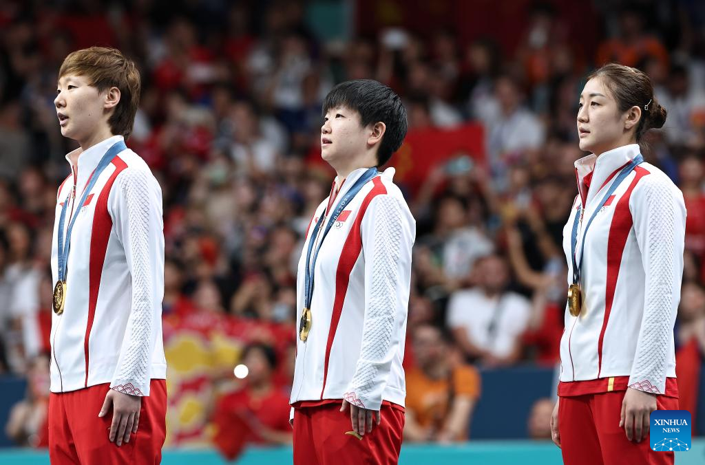 Gold medalists of team China attend the victory ceremony for women's team of table tennis at the Paris 2024 Olympic Games in Paris, France, on Aug. 10, 2024. (Xinhua/Wang Dongzhen)