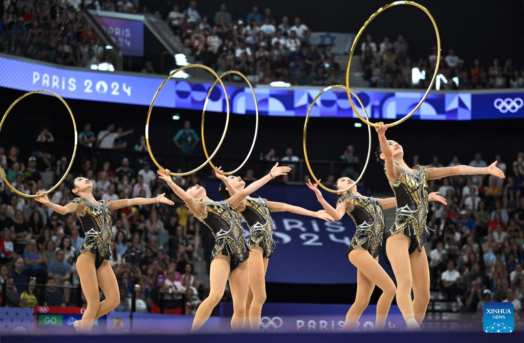Athletes of Team China compete during the group all-round final of rhythmic gymnastics at the Paris 2024 Olympic Games in Paris, France, Aug. 10, 2024. (Xinhua/Cheng Min)