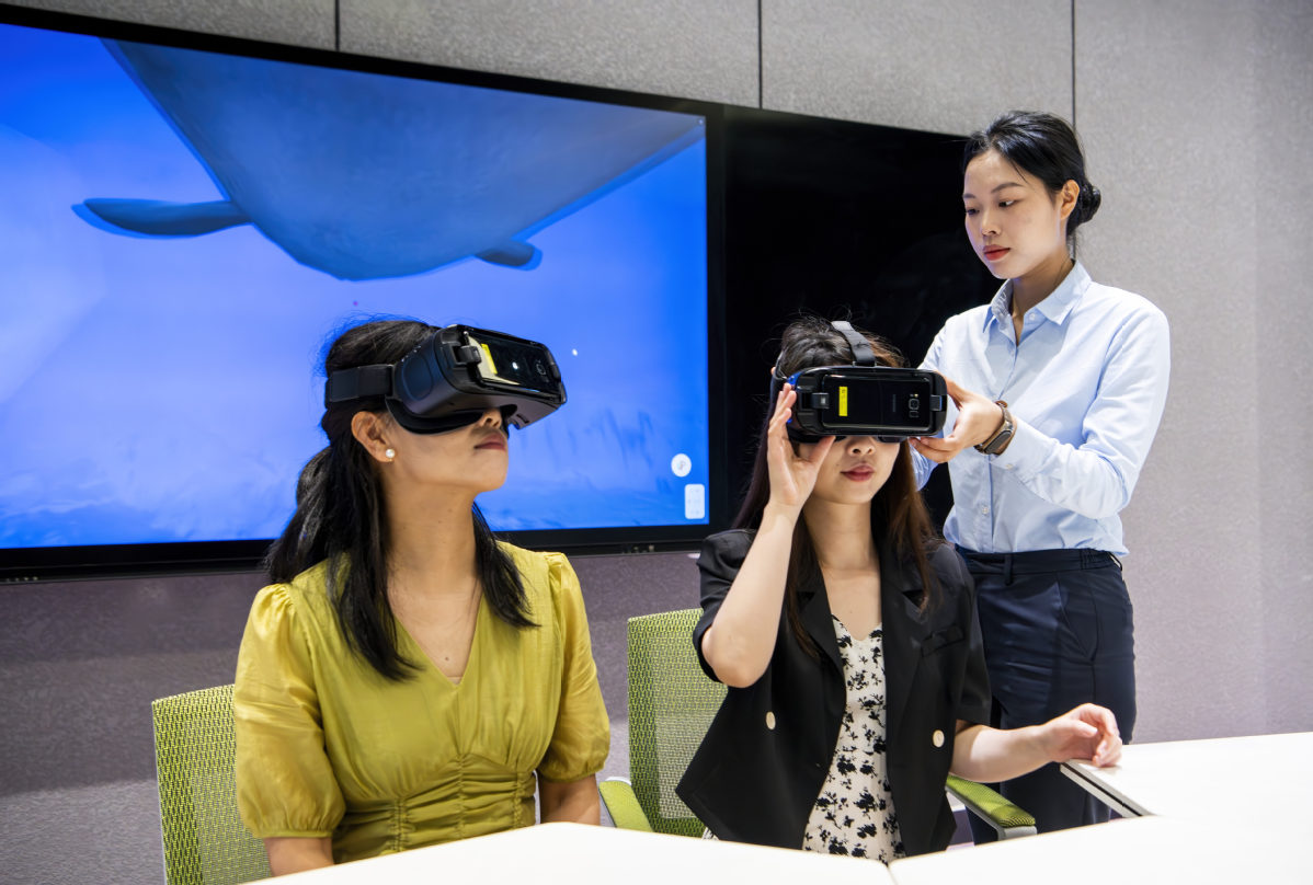 Two visitors try out an AI-enabled education program at a high-tech company in Fuzhou, Fujian province. (Photo/Xinhua)