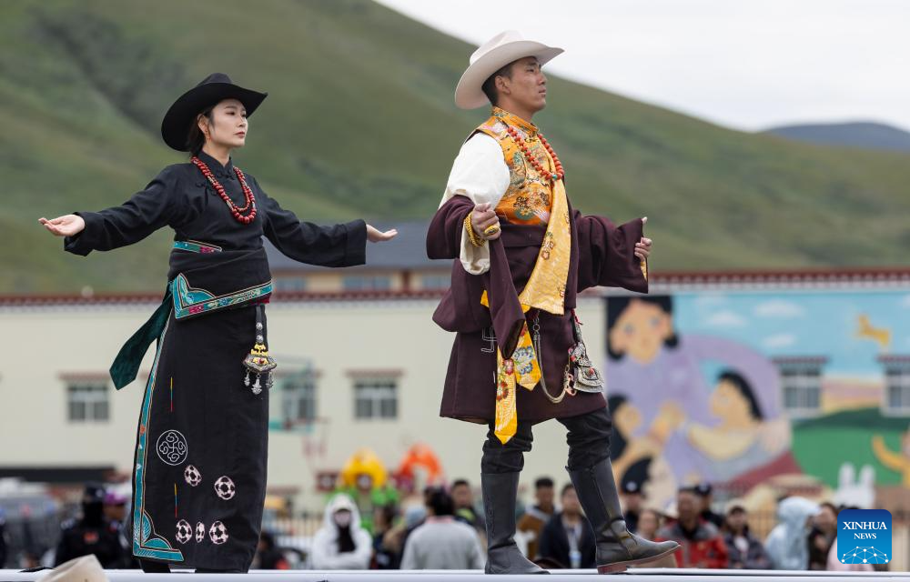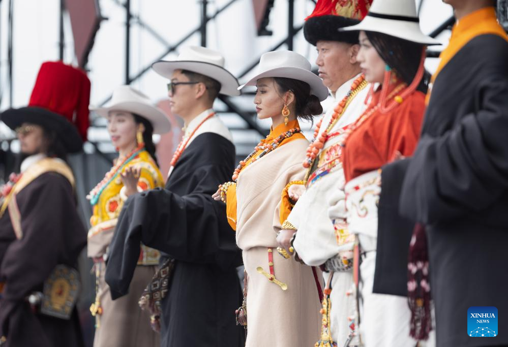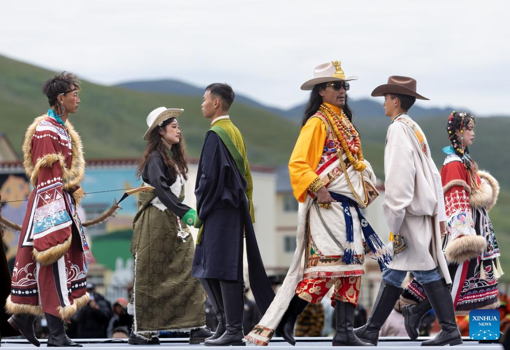 Locals present Tibetan costumes during a fashion show held at the opening ceremony of a nomadic cultural tourism season in Sertar County, southwest China's Sichuan Province, Aug. 10, 2024. (Xinhua/Jiang Hongjing)