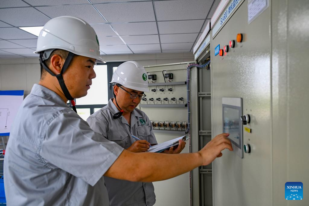 Staff members check devices at the Daxihaizi Reservoir before water diversion in Yuli County, northwest China's Xinjiang Uygur Autonomous Region, on Aug. 11, 2024. Northwest China's Xinjiang Uygur Autonomous Region on Monday began discharging water from a reservoir into the Tarim River, China's longest inland river, as part of an ongoing ecological conservation project in the region.
