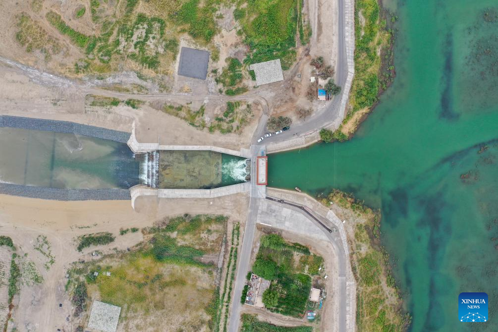A drone photo taken on Aug. 11, 2024 shows staff members monitoring the inflow of water at the Daxihaizi Reservoir in Yuli County, northwest China's Xinjiang Uygur Autonomous Region. Northwest China's Xinjiang Uygur Autonomous Region on Monday began discharging water from a reservoir into the Tarim River, China's longest inland river, as part of an ongoing ecological conservation project in the region.
