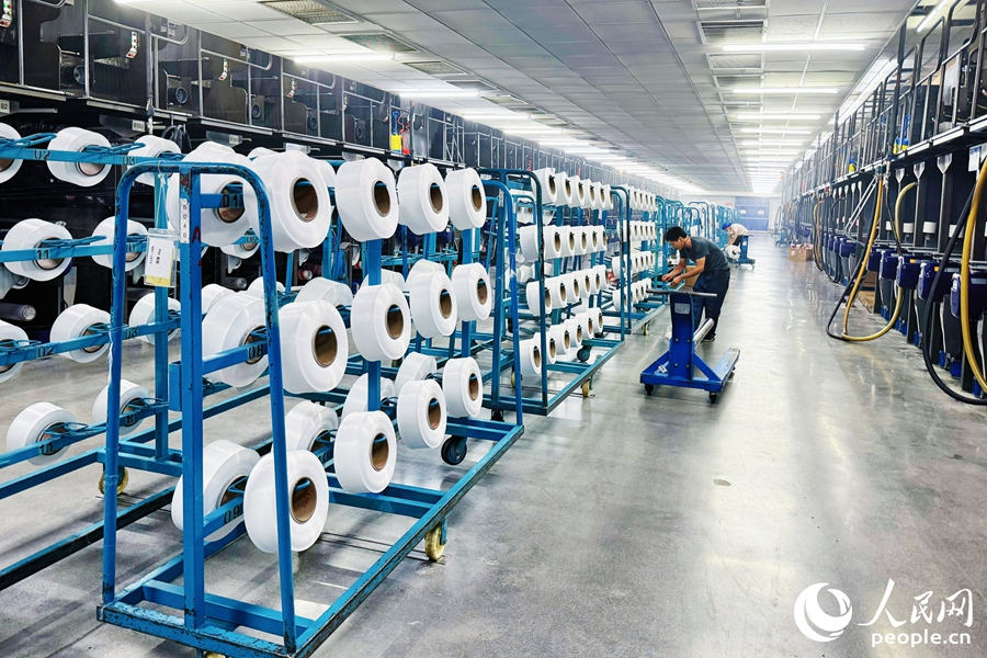 Workers work at a workshop of Fujian Xinsen Synthetic Fiber Technology Co., Ltd. in Youxi county, Sanming city, southeast China’s Fujian Province. (People’s Daily Online/Li Weiyi)
