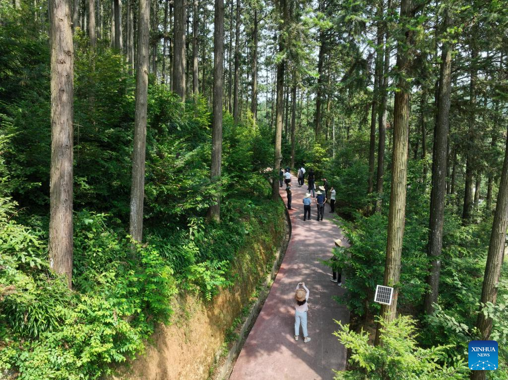 A drone photo shows people visiting a forest farm in Shaxian County, Sanming City, southeast China's Fujian Province, Aug. 10, 2024. Sanming City has been exploring a new path of development that embraces green transformation to boost rural tourism including forest-based health services and other economic activities. Currently, forests cover 77.12 percent of the total area in the city. (Xinhua/Jiang Kehong)